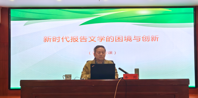 4月25日上午,由湖南省作家协会主办、湖南毛泽东文学院承办的第三十一期“文学名家讲堂”在湖南毛泽东文学院报告厅举行,中国报告文学学会会长徐剑带来了以《新时代报告文学困境与创新》为题的精彩文学讲座,参加中国报告文学学会四届五次理事会的理事、湖南省首届自媒体作家班学员和广大文学爱好者聆听了讲座。讲座由中国报告文学学会副会长,省文联副主席、省作协副主席,湖南毛泽东文学院副院长纪红建主持。