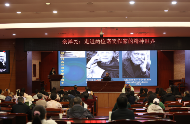 课堂上,余泽民从地理、人文维度介绍了匈牙利。他指出,这个东欧国家2002年、2025年出了两位诺奖作家,其作品以“大屠杀、集中营”为母题,“屈辱即生存”是核心烙印。他还与学员分享了与拉斯洛的交往故事和两人相互成全的经历,让学员深切感受文学无国界的力量。